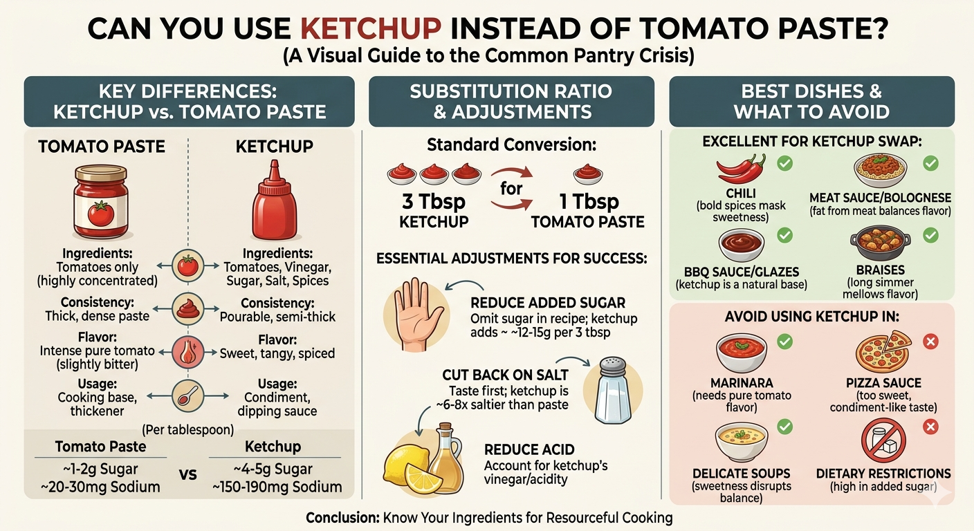 การใช้ซอสมะเขือเทศแทนซอสมะเขือเทศเป็นวิธีการแก้ปัญหาในครัวที่ถูกต้องตามกฎหมาย — ไม่ใช่สิ่งทดแทนที่สมบูรณ์แบบ แต่เป็นสิ่งที่ใช้งานได้จริงซึ่งจะช่วยประหยัดมื้ออาหารเมื่อคุณไม่มีทางเลือก สิ่งสำคัญคือการทำความเข้าใจความแตกต่าง: ซอสมะเขือเทศมีรสหวานกว่า ทินกว่า เค็มกว่า และมีกรดมากกว่า ใช้อัตราส่วน 3:1 ลดน้ำตาลและเกลืออื่นๆ ปรุงตั้งแต่เนิ่นๆ และเลือกอาหารที่เหมาะสม